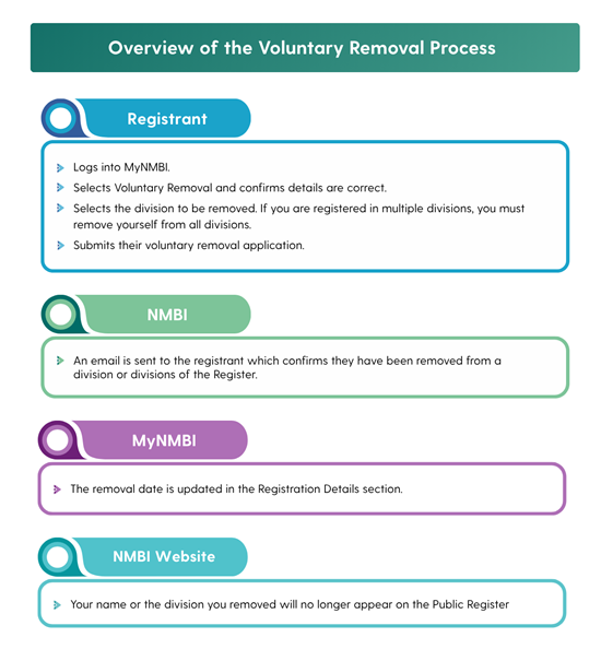 The voluntary removal facility is open at all times on MyNMBI except for a very short period of time to allow the Board to remove registrants for non-payment of retention fee.